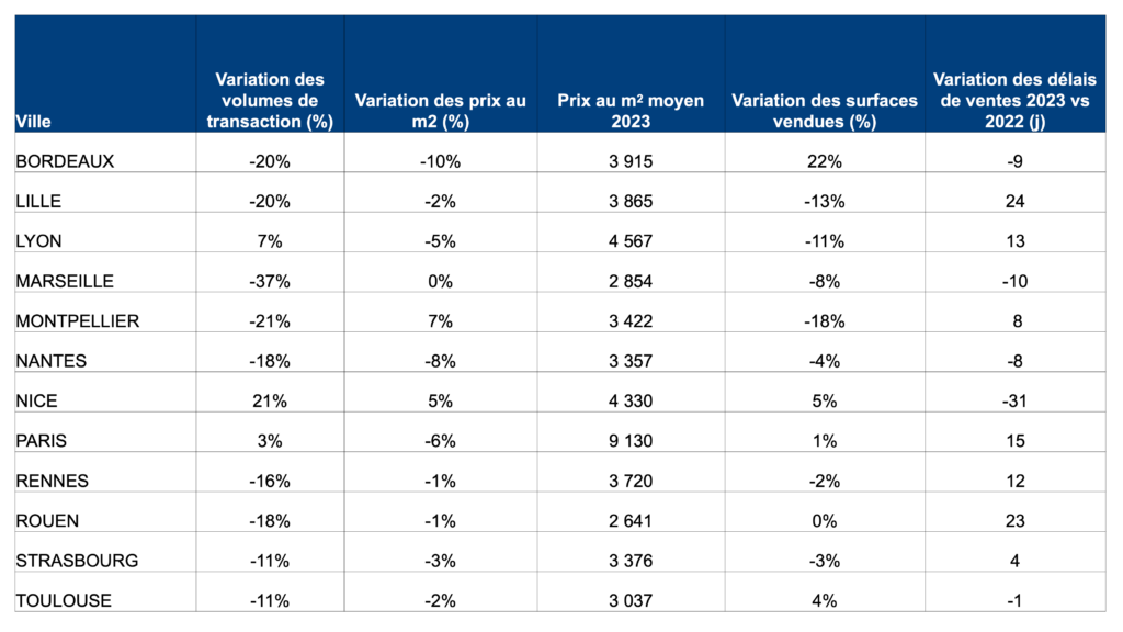 En ce qui concerne les métropoles, les données Foncia démontrent que Marseille est la métropole où les volumes de transaction chutent le plus (-37%), suivie par Montpellier (-21%). Néanmoins, l’intérêt pour Nice se confirme avec une hausse des ventes et des prix. Paris reste prisée mais les prix au m2 dans la capitale passe en deçà de la barre symbolique des 10 000 €.
